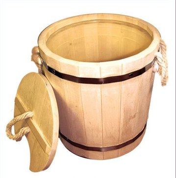 Выполнен из брусков липы, стянутых двумя металлическими обручами, внутри предусмотрена пластиковая вставка, позволяющая избежать протекания жидкости. Для более удобного использования запарник имеет по бокам две небольшие веревочные ручки, а также деревянную крышку.Такой запарник доставит вам настоящее удовольствие от банной процедуры. При запаривании веник обретает свою природную силу и сохраняет полезные свойства.Материал: дерево (липа), металл, пластик. Высота запарника: 29 см.