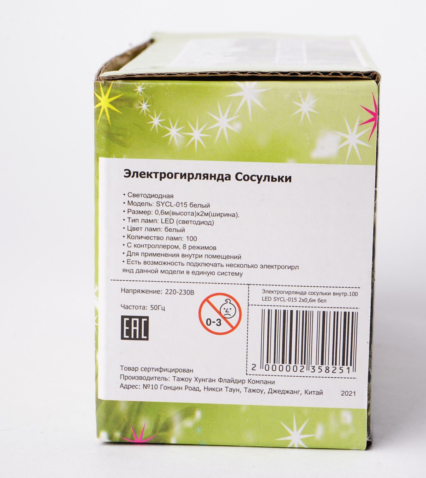 - Электрогирлянда сосульки внутренняя 2х0,6м 100LED холодный белый SYCL-015