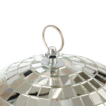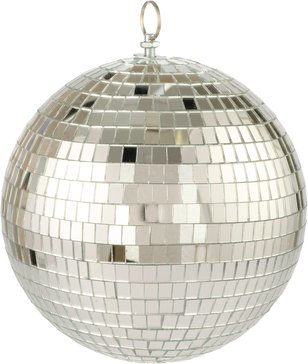 Шар оформлен небольшими зеркальными элементами, которые эффектно преломляют свет прожекторов или гирлянд и наполняют помещение необычными цветными бликами.