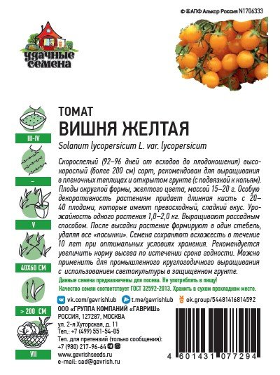 -30%Раннеспелый (92-96 дней от всходов до плодоношения) высокорослый (более 200 см) сорт, рекомендован для выращивания в пленочных теплицах и открытом грунте (с подвязкой к кольям). Выращивают рассадным способом. После высадки растение формируют в один стебель, удаляя все «пасынки». Плоды округлой формы, желтого цвета, массой 15-20 г. Особую декоративность растениям придает длинная кисть с 20-40 плодами, которые имеют превосходный, сладкий вкус. Урожайность одного растения 1,0- 2,0 кг.