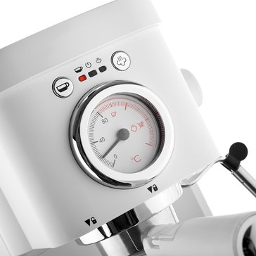 Кофеварка с мощностью 1100 Вт и давлением в помпе 15 бар поможет Вам приготовить крепкий кофе с насыщенным вкусом. С ней Вы сможете приготовить как эспрессо, так и капучино или латте. А встроенный термометр обеспечит точный контроль температуры для получения высокого качества кофе. В устройстве присутствует функция приготовления кофе на 2-х человек одновременно.