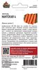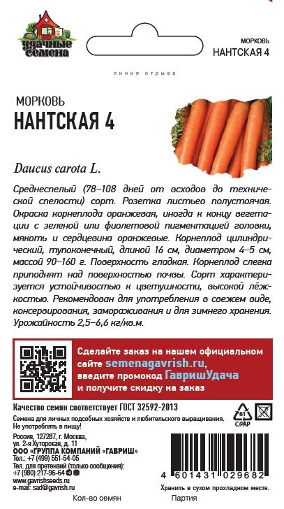 -30%Среднеспелый (78-108 дня от всходов до технической спелости) сорт. Посев семян в грунт производится в конце апреля – начале мая на глубину 1 см, расстояние между рядками 15 см. Подросшие всходы прореживают, оставляя между растениями по 5-7 см. Розетка листьев полустоячая. Окраска корнеплода оранжевая, иногда к концу вегетации с зеленой или фиолетовой пигментацией головки, мякоть и сердцевина оранжевые, иногда светло-оранжевые. Корнеплод цилиндрический, тупоконечный, длиной 16 см, диаметром 4-5 см, массой 90-160 г. Сердцевина округлая и угловато-округлая. Поверхность гладкая. Корнеплод слегка приподнят над поверхностью почвы. Сорт характеризуется устойчивостью к цветушности, высокой лежкостью. Рекомендован для потребления в свежем виде, консервирования, замораживания и для зимнего хранения. Урожайность 2,5-6,6 кг/м2.