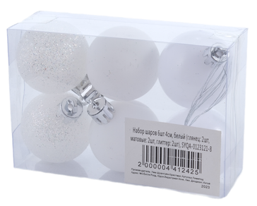 - Набор шаров 6шт 4см, белый (глянец: 2шт, матовые: 2шт, глиттер: 2шт), SYQA-0123121-8