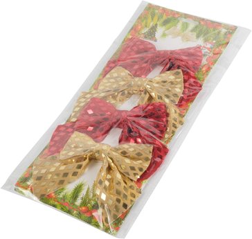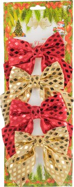 Золотой и красный цвет-это всегда универсальное решение для украшения, тем более, для новогоднего. В этом вам помогут украшения в форме бантиков, которые красиво и лаконично украсят хвойную красавицу и наполнят дом праздничной атмосферой.