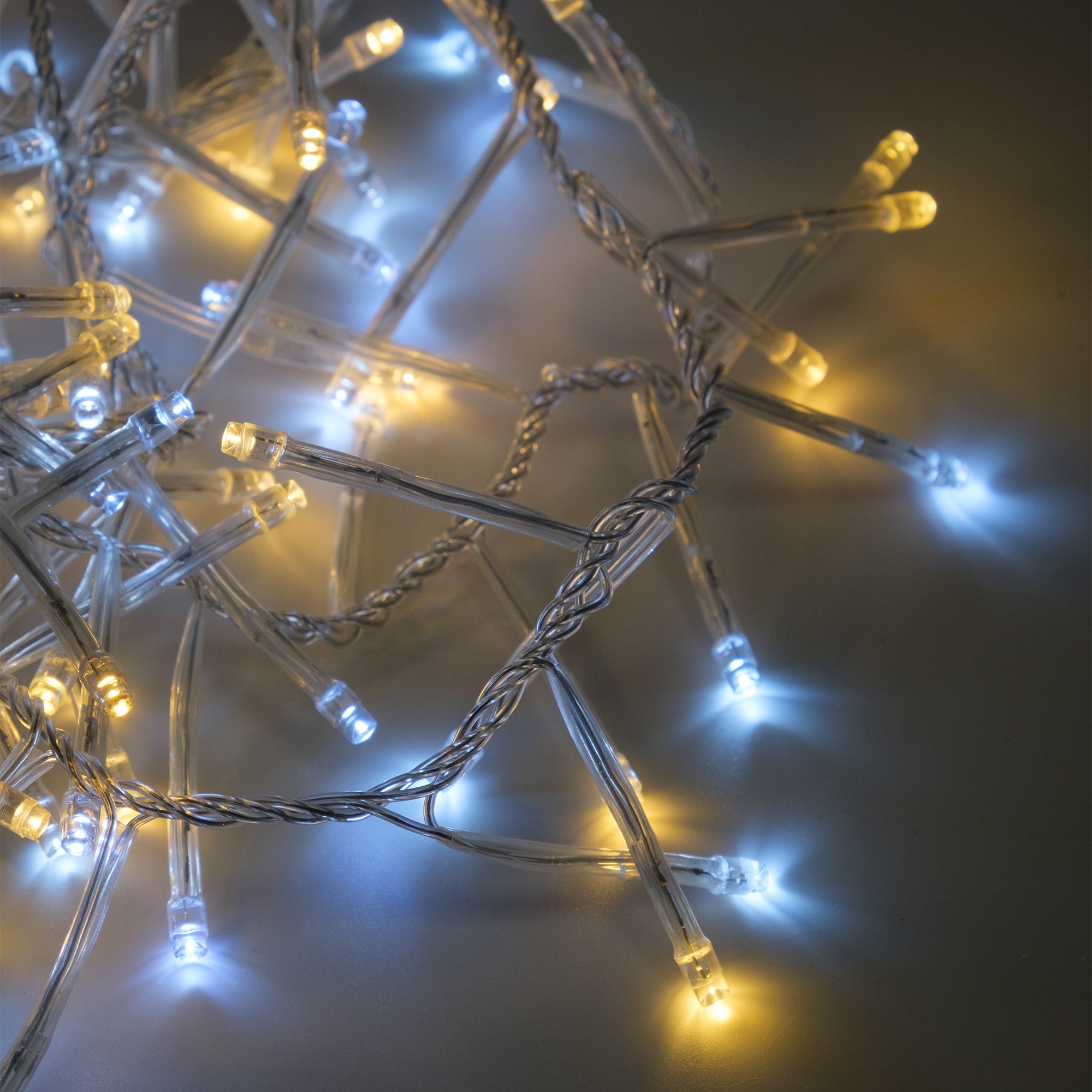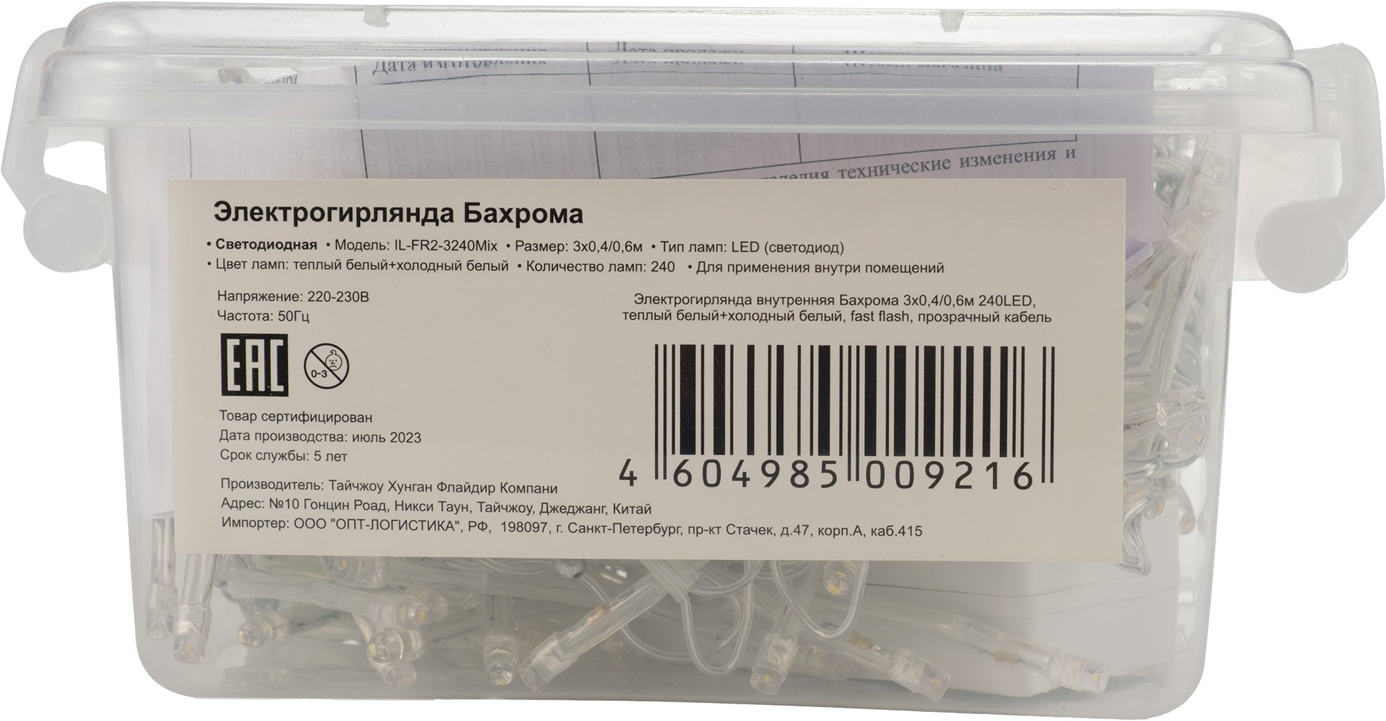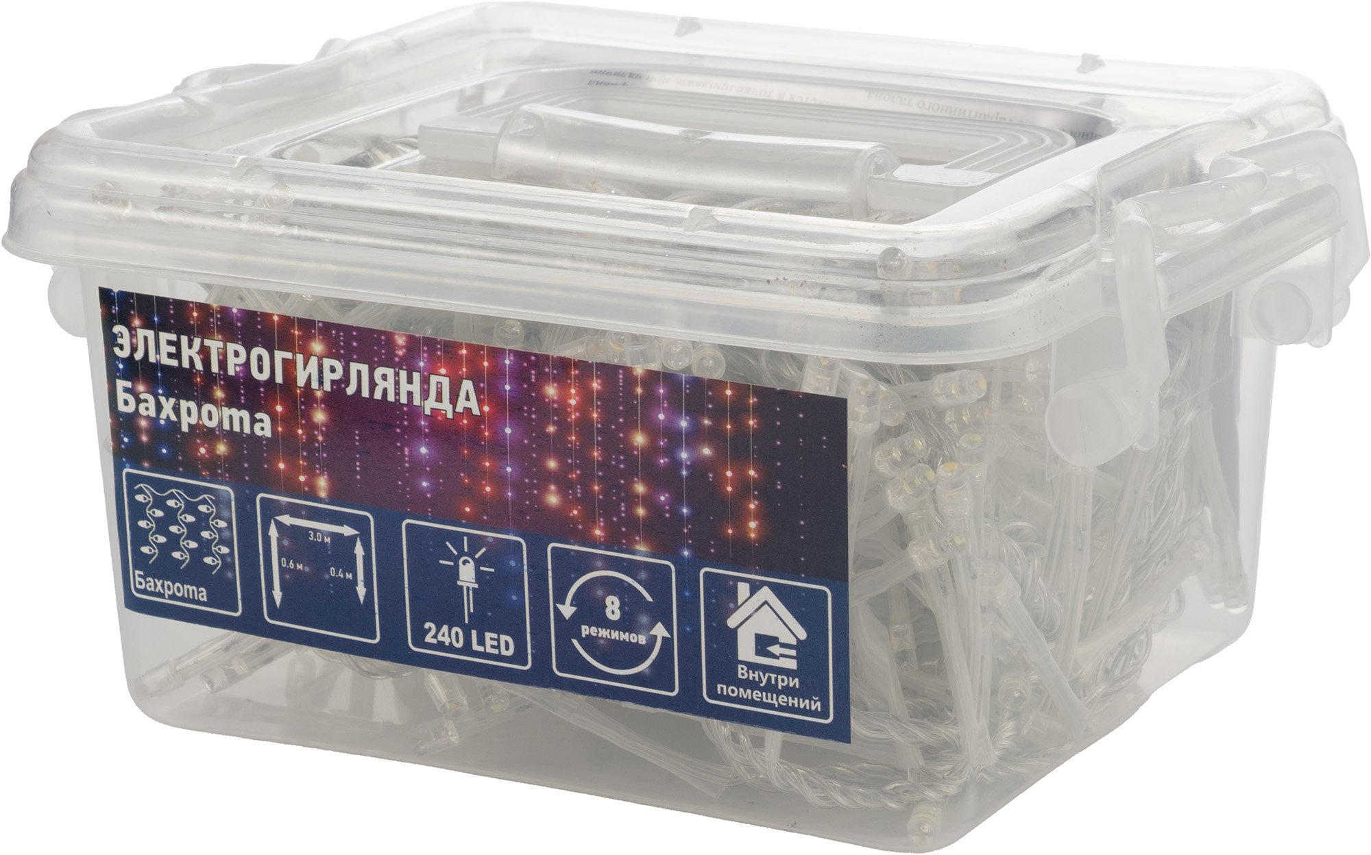 - Электрогирлянда внутренняя Бахрома 3х0,4/0,6м 240LED, теплый белый+холодный белый, fast flash, прозрачн.кабель