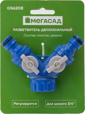 - Разветвитель регулируемый Мегасад 2-х канальный со штуцерами для шланга 3/4"