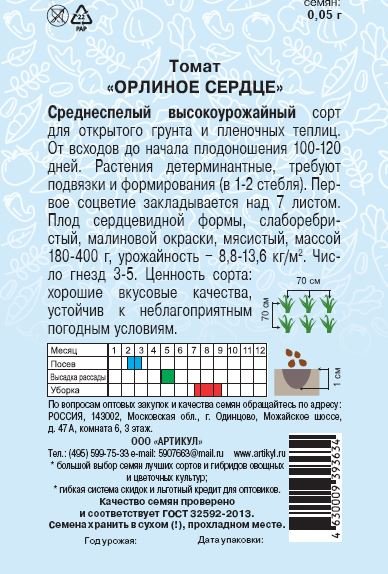 -27%Среднеспелый высокоурожайный сорт для открытого грунта и пленочных теплиц. От всходов до начала плодоношения 100-120 дней. Растения детерминантные, требуют подвязки и формирования (в 1-2 стебля). Первое соцветие закладывается над 7 листом. Плод сердцевидной формы, слаборебристый, малиновой окраски, мясистый, массой 180-400 г, урожайность