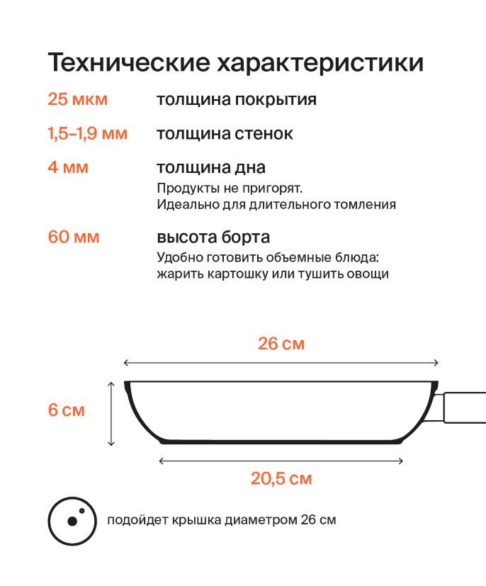 Диаметр по верху (крышка): 26 см, высота бортика 60мм, толщина стенок 1,5-1,9 мм, толщина дна 4,0 мм. Подходит для всех видов плит, включая индукционную. Можно мыть в посудомоечной машине.