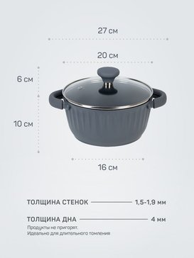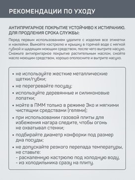 В комплекте идет крышка из термостойкого стекла, сьемные силиконовые ручки. Продается в подарочной упаковке.
