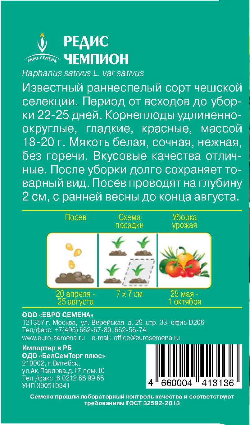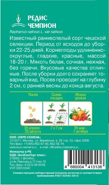 -30%Известный раннеспелый сорт чешской селекции. Период от всходов до уборки 22 – 25 дней. Образует удлиненно-округлые, гладкие, красные корнеплоды массой 18 – 20 г. Мякоть белая, сочная, нежная, без горечи. Вкусовые качества отличные. После уборки долго сохраняет товарный вид корнеплода. Посев проводят на глубину 2 см, с ранней весны до конца августа.