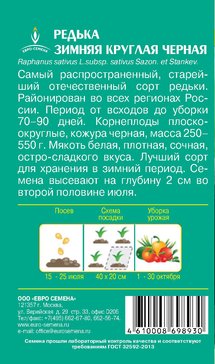 -30%Самый распространенный, старейший отечественный сорт редьки. Районирован во всех регионах России. Период от всходов до уборки 70 – 90 дней. Корнеплоды плоско-округлые, кожура черная, масса 250 – 550 г. Мякоть белая, плотная, сочная, остро-сладкого вкуса. Лучший сорт для хранения в зимний период. Семена высевают на глубину 2 см во второй половине июля.