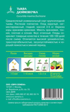 Тыква «Дюймовочка» — очаровательная малышка! Плоды небольшие, порционные, весом около 1 кг, ярко-оранжевые, слегка ребристые. Мякоть оранжевая, сладкая, с ореховым привкусом. Идеальна для запекания целиком или порционно. Хранится хорошо. На одном растении завязалось много плодов. Прекрасный сорт для десертов и детского питания. Семена в цветном пакете взошли все.