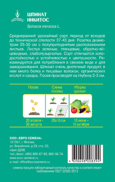 -30%Среднеранний урожайный сорт, период от всходов до технической спелости 37-43 дня. Розетка диаметром 25-30 см с полуприподнятым расположением листьев. Листья зеленые, глянцевые, обратно-яйцевидные, слабопузырчатые. Сорт отличается холодостойкостью и устойчивостью к цветушности. Рекомендуется для потребления в свежем виде и для замораживания. Шпинат очень диетичный продукт, в нем много белка и пищевых волокон, органических кислот и сахара. Посев производят на глубину 2-3 см.