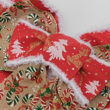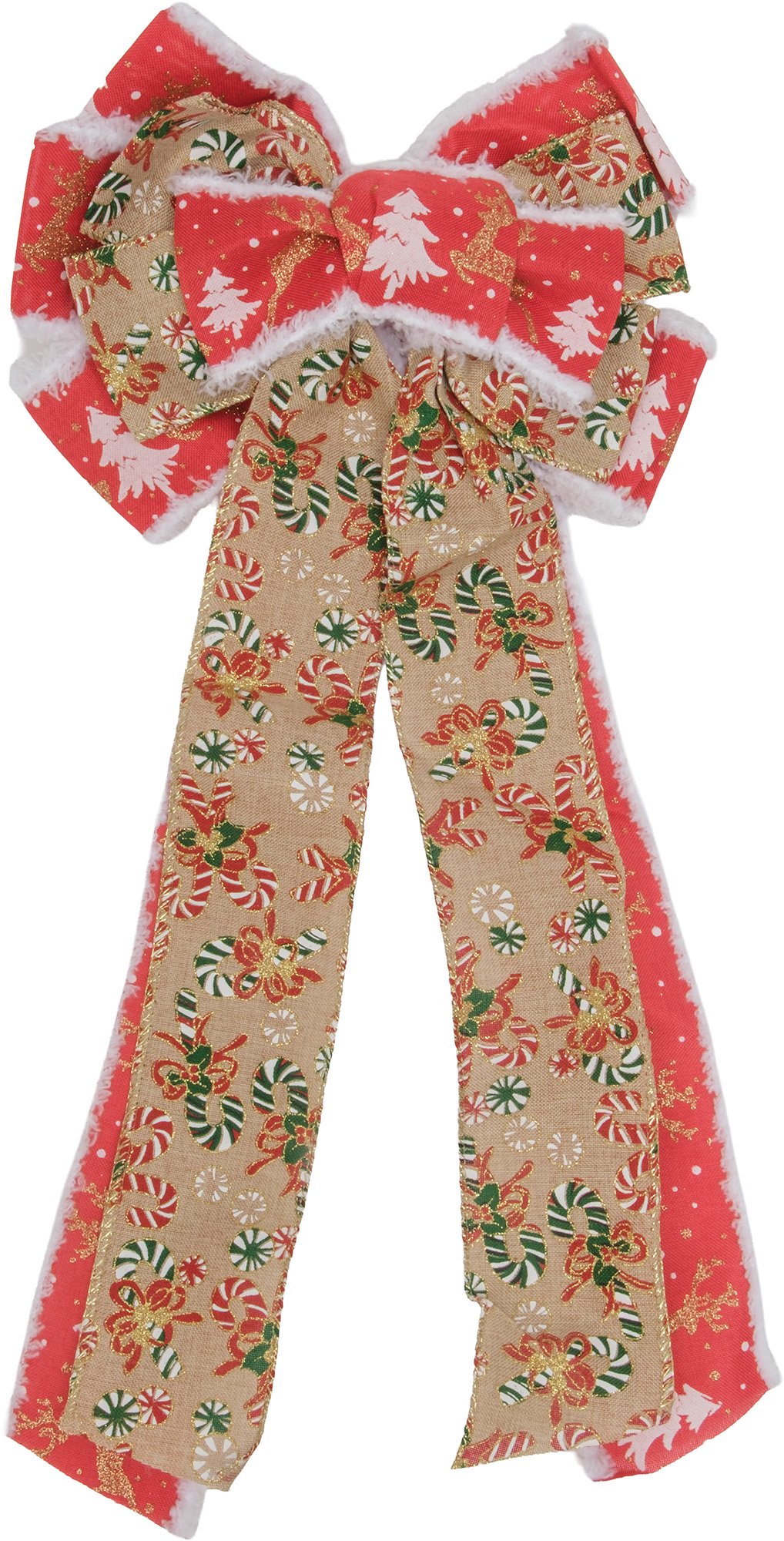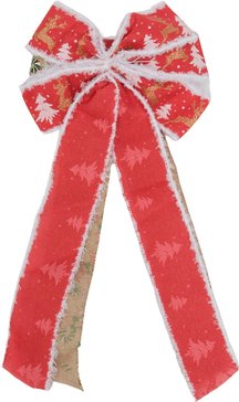 Яркий красно-золотой бант — идеальный акцент для новогоднего декора! Размер 25х55см делает его заметным, но не громоздким: он гармонично дополнит подарочную упаковку, ёлочную игрушку, праздничный венок или интерьерный ансамбль.