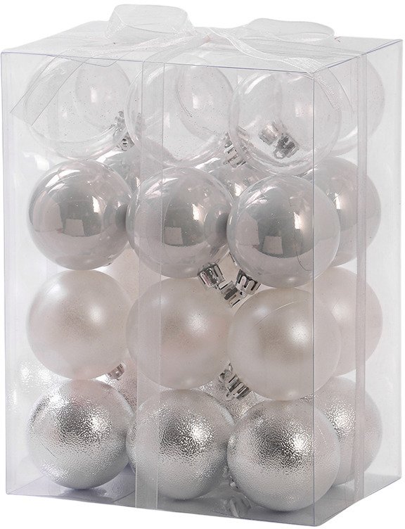 Создайте волшебную атмосферу праздника с великолепным набором из 24 шаров! Изысканное сочетание прозрачного, серебристого и белого цветов создаст неповторимую композицию на вашей ёлке.