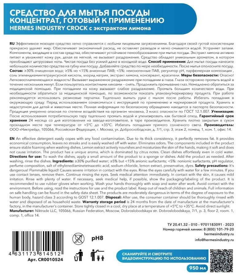 - Гель д/мытья посуды Hermes Industry Home Crock 950мл Лимон