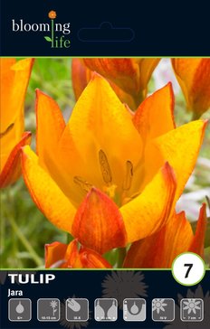 Цветки звездообразной формы. Окраска лепестков ярко-желтая с красноватым оттенком, у основания — тёмно-жёлтая. Лепестки узкие, заострённые, гладкие по краю. Диаметр цветка 4–6 см, при полном раскрытии достигают 10 см. Высота растения 10–15 см. Период цветения: начало апреля - середина мая.  Хорошо смотрится в группах и подходит для выращивания в контейнерах. Идеален для срезки