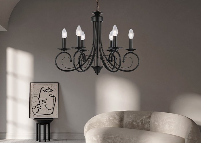 Модель TR9612 представлена в современном стиле неоклассика. Светильник выполнен из черного металлического каркаса. Для данной модели подойдут лампы с цоколем Е14.