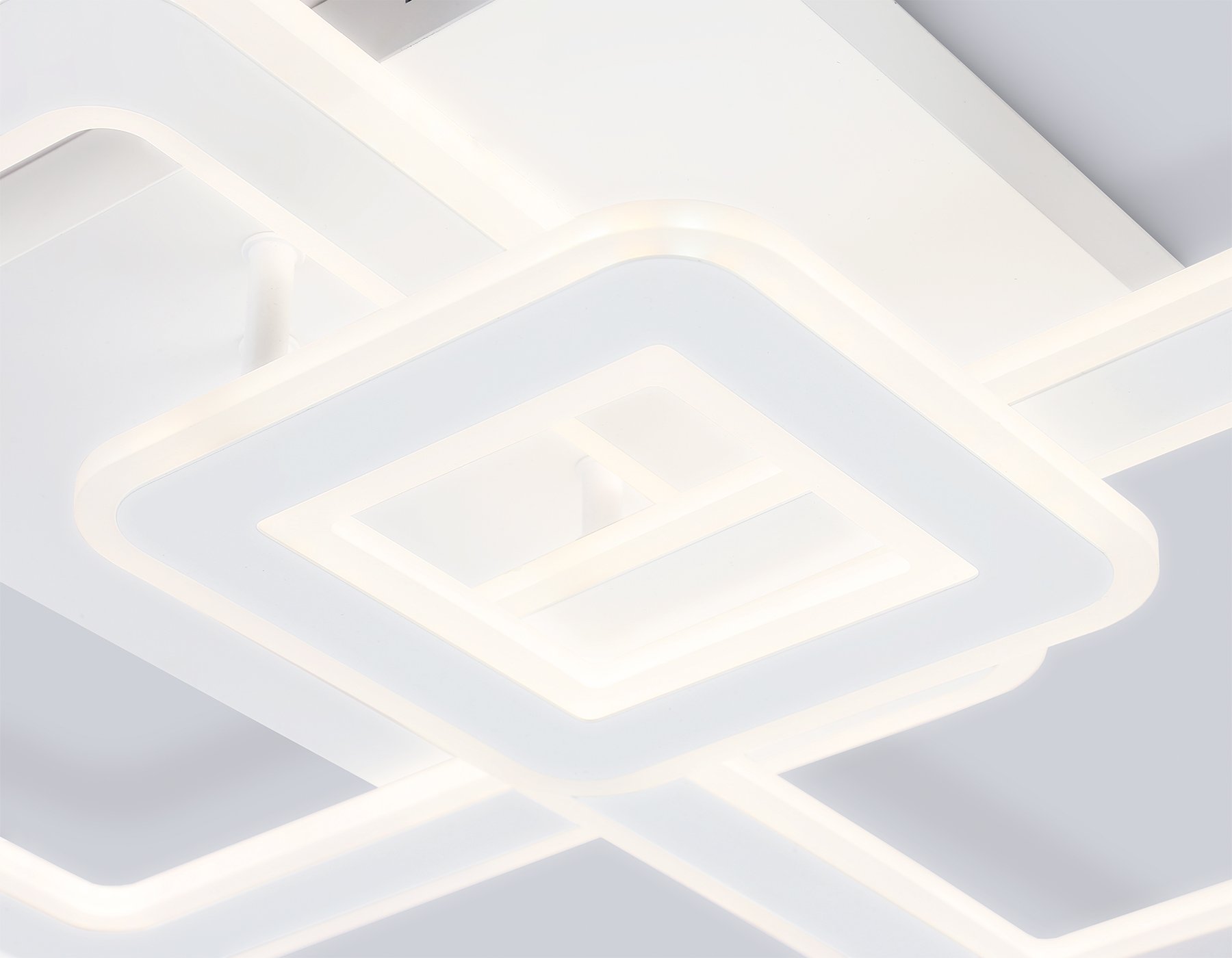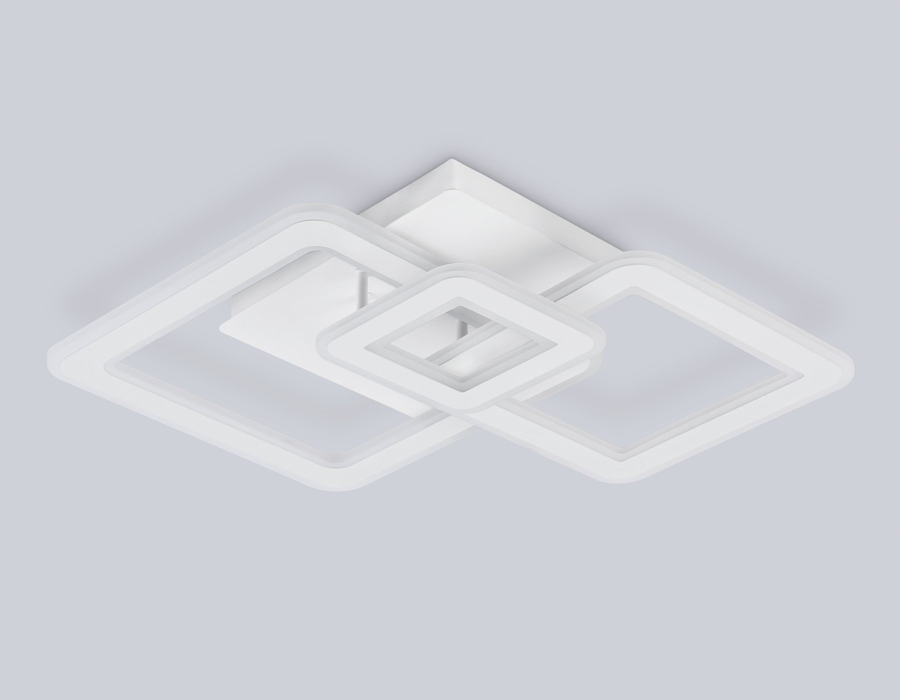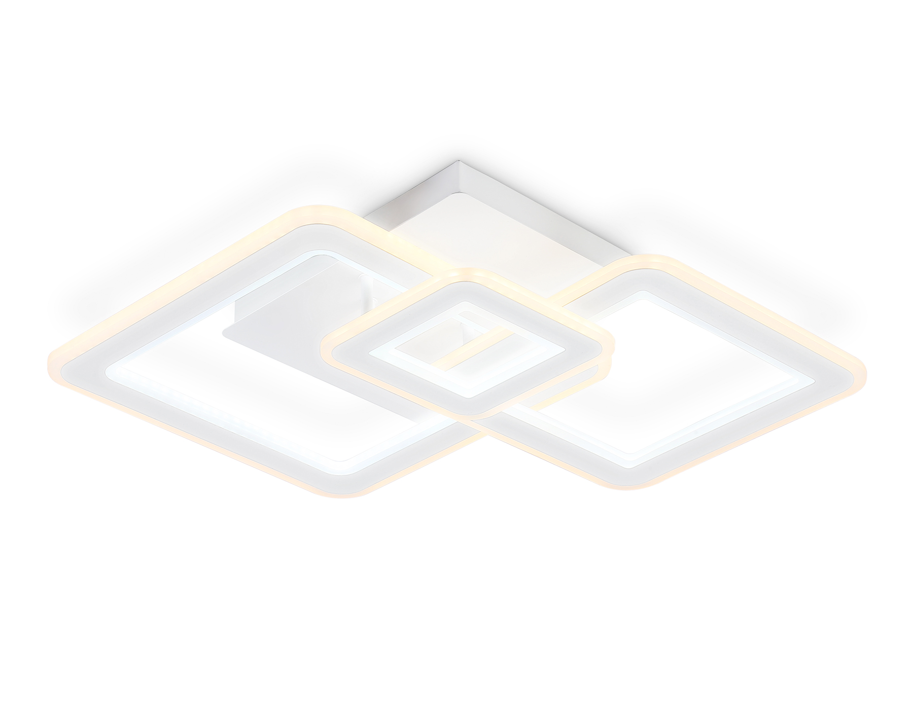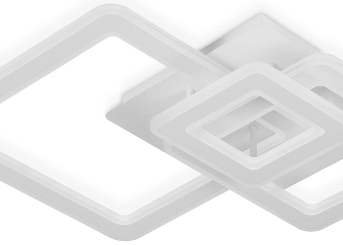 Потолочный светодиодный светильник из серии ACRYLICA, коллекция Original. Ультрасовременная модель FA862 выполнена в современном стиле Хай-тек. Светильник формы пересечения трех квадратов, белого цвета, изготовлен из акрила и металлического корпуса. В конструкцию этого светильника уже встроены светодиоды, что исключает поиск или замену дополнительных ламп. С помощью радиоуправляемого пульта вы сможете регулировать цветовую температуру, яркость освещения и ночной режим. Модель FA862 подходит для натяжных потолков и будет прекрасным дополнением в гостиной, спальне или детской комнате.