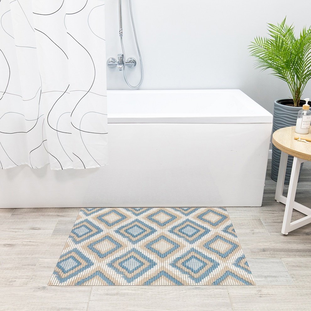 Коврик для ванной комнаты. Состав: 100% ПВХ (поливинилхлорид). Обладает противоскользящими и грязеотталкивающими свойствами, покрытие безвредно для кожи. Хорошо впитывает влагу, гигиеничен и не теряет первозданный внешний вид даже после стирки в стиральной машине (рекомендованная температура стирки - 40 градусов). Ковер прост в уходе, не требует специальной чистки.