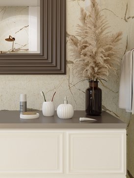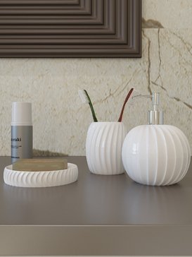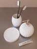 Керамический стакан для зубных щёток — универсальный аксессуар для идеального порядка в ванной. Цилиндрическая форма с выразительной ребристой поверхностью добавляет изделию динамики и обеспечивает удобное хватание. Изготовленный из влагоустойчивой керамики, стакан надёжно защищён от испарений и сохраняет безупречный вид даже при постоянном контакте с водой. Вместительная ёмкость легко размещает зубные щётки, станки, кисточки и тюбик пасты, превращая беспорядок на раковине в продуманную композицию.