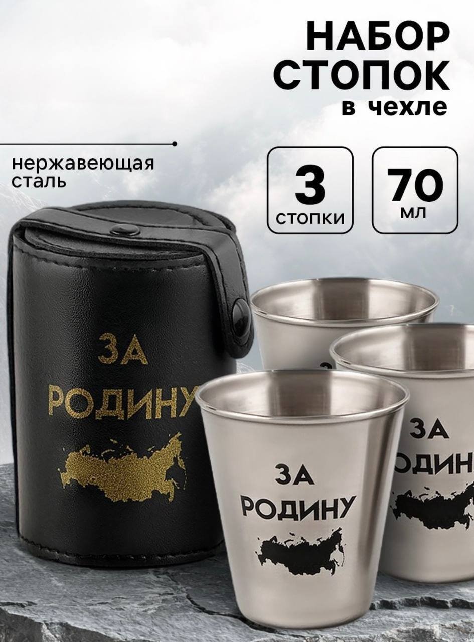 Набор стопок из 3 штук по 70 мл из пищевой нержавеющей стали в компактном чехле. Легкие и компактные, удобно брать с собой на отдых, рыбалку, охоту, природу или в путешествия.