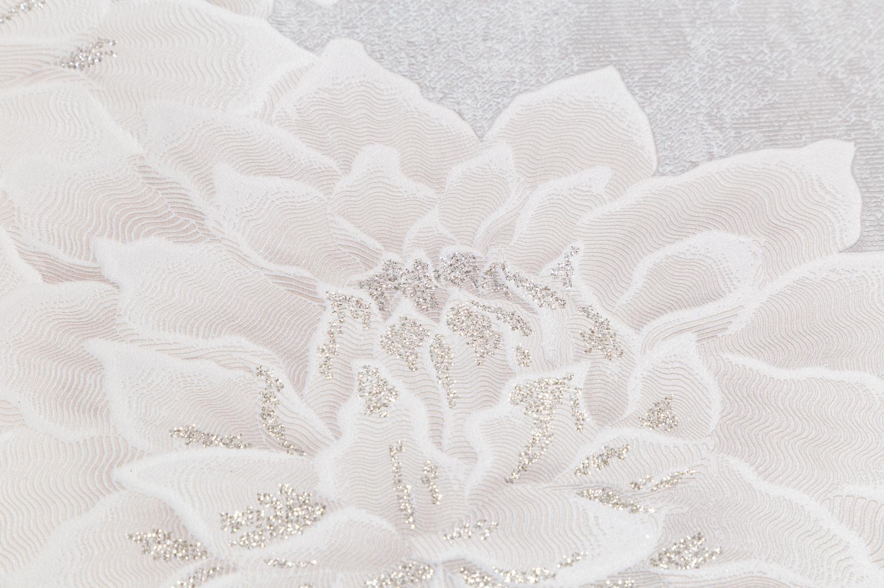 Мерцающие акценты деликатно подчёркивают отдельные участки лепестков, добавляя рисунку живости и сияния. При разном освещении блеск меняет свою интенсивность, создавая впечатление, будто лепестки слегка подсвечены мягким рассветным светом. Такой деликатный эффект подчёркивает объём рисунка, не перегружая пространство.